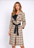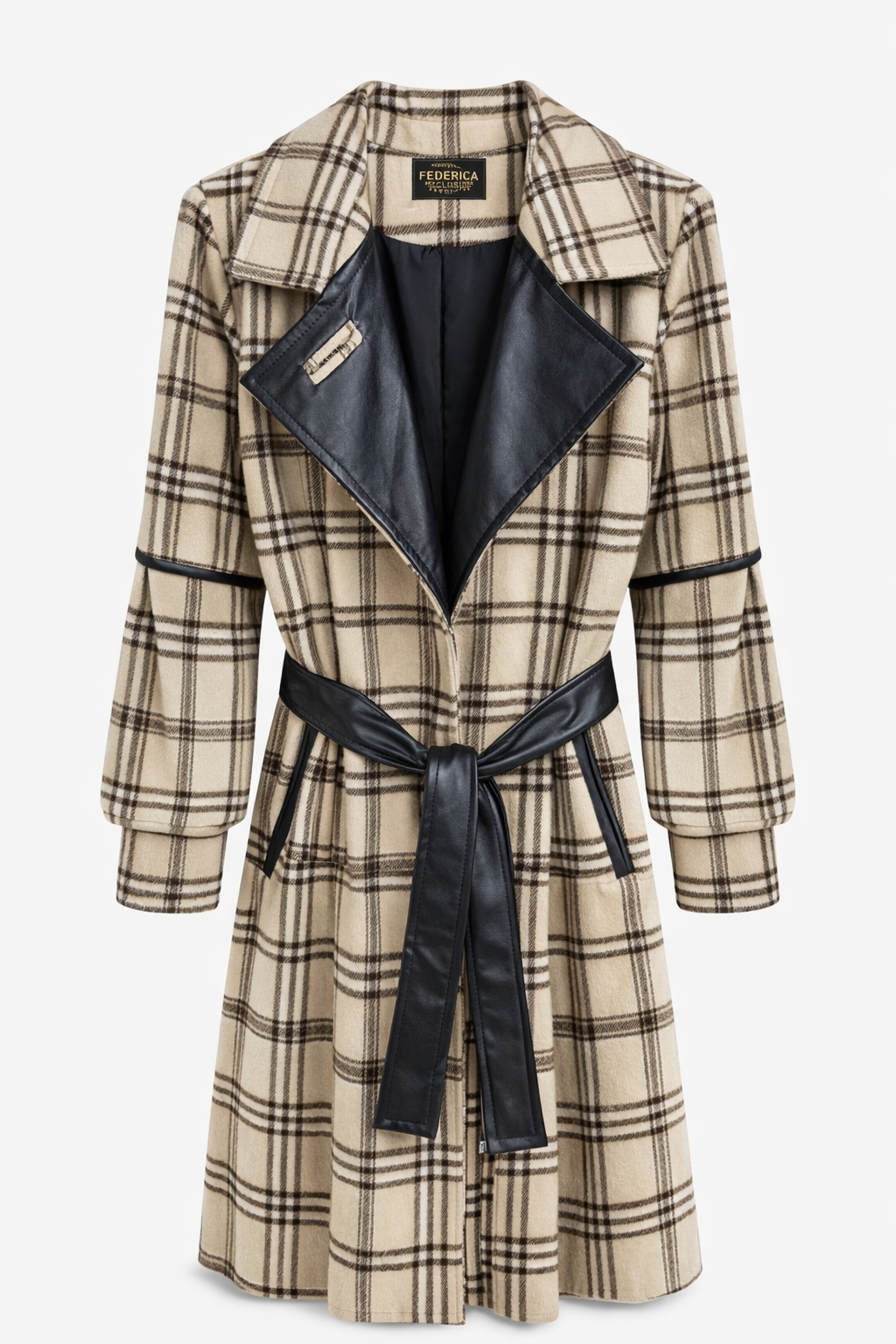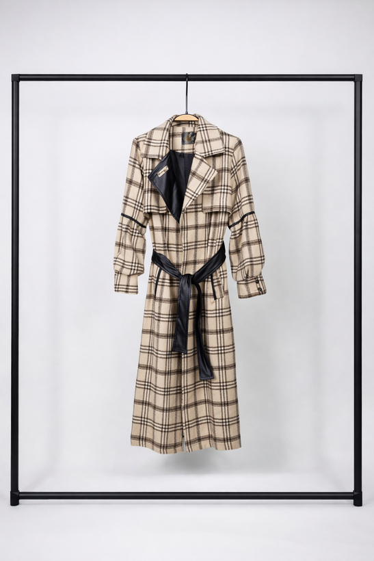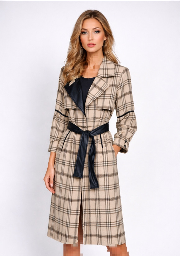 پالتو زنانه چهارخانه ترکیب پشم و چرم | یقه انگلیسی، کمربند چرمی
